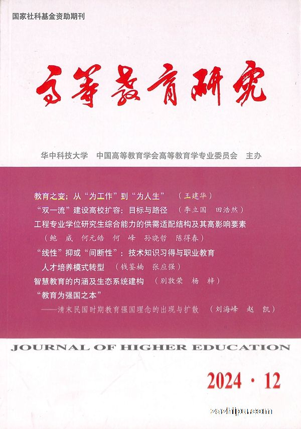 刊名:《高等教育研究》 《高等教育研究》1980年创刊,由华中科技大学与该专业委员会共同主办。设有高等教育改革与发展、教育基本理论、教育体制与结构、院校研究、教育经济与财政、民办与职业高等教育、学位与研究生教育、教师教育与教师发展、课程理论与教育改革、学生工作与学生事务、教育与教育思想史、国际与比较高等教育、教育学学科建设等栏目,并不定期组织各种专题研究。